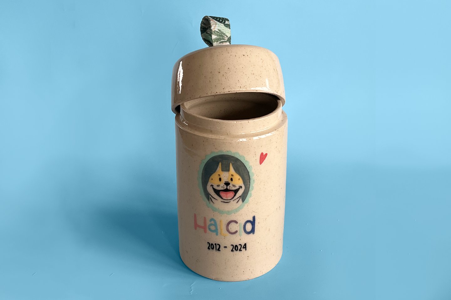 Personnalisez une urne avec une illustration de votre animal, son nom, date de naissance et date de décès.