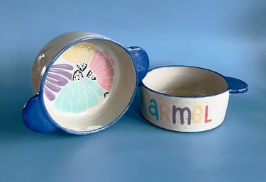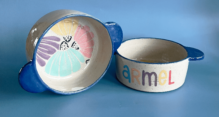 Je revisite le traditionnel bol breton à ma façon, forme de gamelle, mythiques oreilles et liseré bleu. Mais on retrouve également la typographie colorée de Boulinette ainsi qu'un joli motif floral au fond du bol.